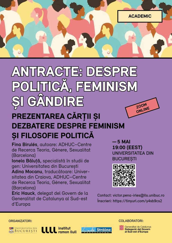 Pe 5 mai, de la ora 19:00 (EEST), pe platforma Zoom, va avea loc lansarea cărții Antracte. Despre politică, feminism și gândire, de Fina Birulés. ”Volumul propune o reflecție asupra feminismului, diferenței și egalității, precum și o redefinire a ceea ce înseamnă să fii femeie în relație cu subiectivitatea, genul și responsabilitatea politică.”