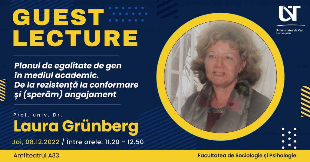 Pe 8 decembrie, invitată de Universitatea de Vest din Timișoara, prof. Laura Grünberg, va discuta despre planurile de egalitate de gen din universități, împărtășind din experiența implementării Planului în cadrul UB.